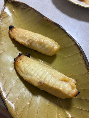 フグの半身の味噌漬けをそのまま焼いて、葉っぱのお皿の上に^^