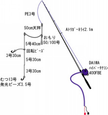 ブログで仕掛けのアドバイスを募ってみたら、以前天秤仕掛けで東京湾アカムツ釣っていたという情報をもらい、参考にしてできたのがこれ。胴突きの50cm枝でも釣れるんだからと、かなり短めの作りになってます。捨て糸短い胴突きのベタ底でも下針ばっかり食ってくることから、底を2本針で少し広く狙うイメージ。サルカンとかを使わずに回転ビーズで浮きやすくし、サバ短冊の抵抗で、横に広がる仕掛けの姿描いてます。