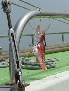 あがってきたのは25cmぐらいの赤い魚体のアカムツ。。船長がタモで救ってくれてあ~今日のおかずはゲットできました。160mで天秤でも釣れました。