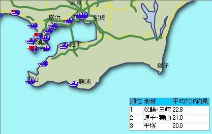この地図の地域で釣れていて平均TOP釣果がこの表の釣り物なんでしょう?