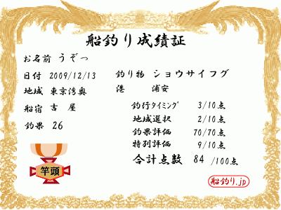 自己申告で、釣果入力すると、下の証書が表示されるので、保存でもしてブログに貼ってください。