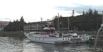 富士丸さんは、船付き場まで一番右の小型船で移動です。