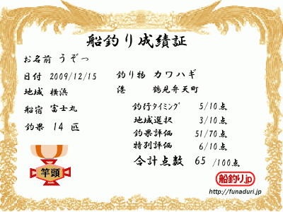 65点か~。こんなもんかな? タイミング的にはトップシーズンだけど釣果安定なので5点。竹岡沖は地域的には今釣れている地域じゃないので3点。釣果は渋いながらも船TOPなので51点。ボーナスは竿頭とかいろいろあるんですが、お客が少なかったのでボーナスは少なめ。