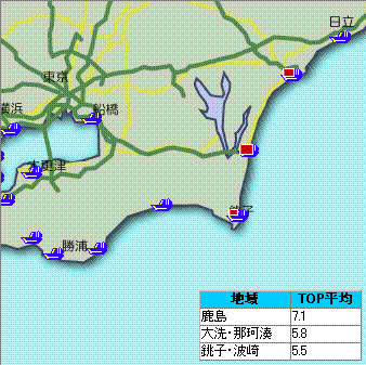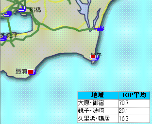 釣れてる場所は外房一色。なかでも鹿嶋の釣果はダントツです。地図で大漁旗立ちまくり!!