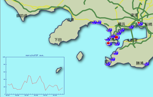 上のマルイカはのマップは今こんな感じ。赤の大きな旗が一番釣れている地域です。グラフは日別変動。