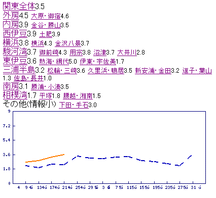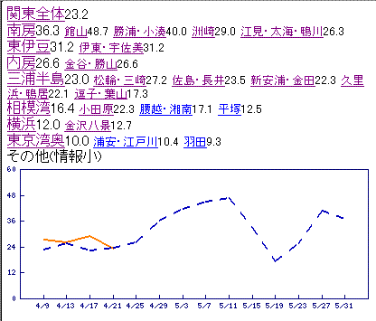 上のグラフは剣崎周辺のマダイのTOP平均(破線が例年、実線が今年)