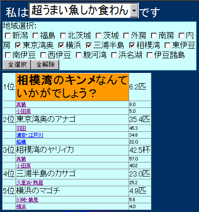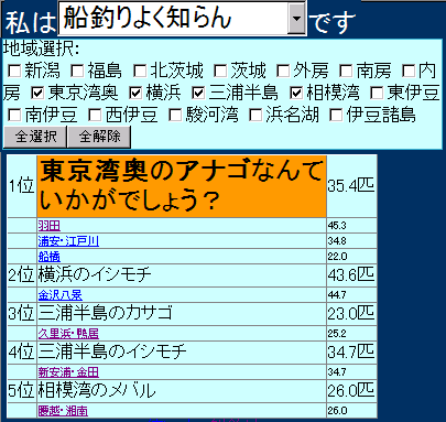 初心者モードにて、近場限定で聞いてみると、アナゴ、イシモチ、カサゴ、メバル