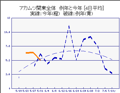 ここ一ヶ月の例年推移が下記の破線で見れますが、たぶん浅場に入っての数釣りが6/20付近のピークだと思います。