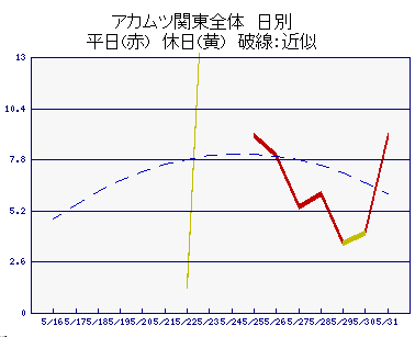 下のグラフは今年の日別変動ですが、やはり湾アカムツは、出船している乗り合い船が少ないので土日渋りはしかたないですね。モロにお客の混み具合が釣果にでちゃってますね。