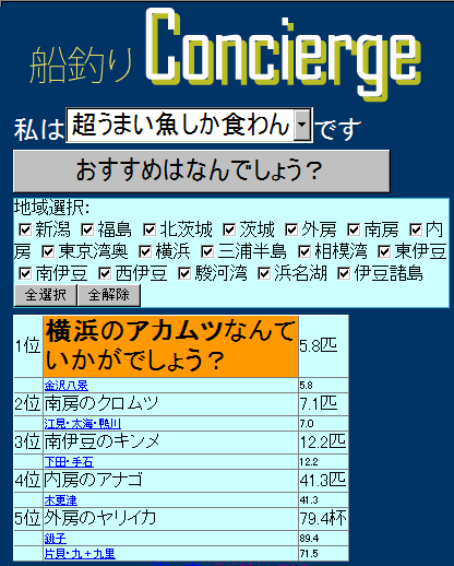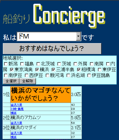 船釣りコンシェルジュは、貴方のタイプと釣果を分析して、地域にあわせたオススメの釣り物を提案してくれます。でも釣果は保証しませんからね!