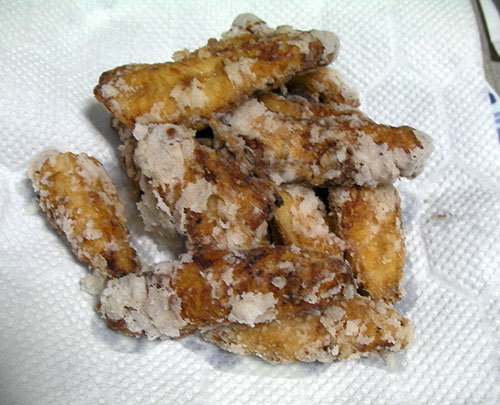 醤油と酒に軽く15分ぐらい付けて下味を付けた身を片栗粉もくるんであげるだけ。