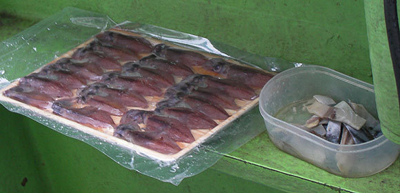 用意した餌はサバ短とホタルイカ。ホタルイカは宿で買えます。生サバとかは若干食いがいいんですが、この宿のサバ短は、非常に綺麗に作ってあって、トータルでは差があんまりでないんです。ホタルイカは、たまに食いがいいときがあるので、シーズン当初となると、一応用意しました