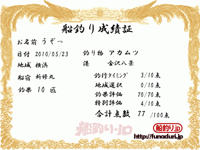 で成績証はコレ ひさびさの釣果満点 地域ポイント0点 そりゃ船の実績ないっすから