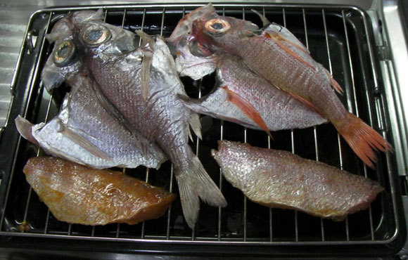 次の日は、辛味噌付け、味噌漬け、シロムツ干物、アカムツ干物をいっきにコンロで焼きます。なんて贅沢な~っ