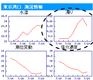 船釣り.jpでは、湾口の潮の濁り具合もモニタしていて、最近は濁りが入ってきている様子。