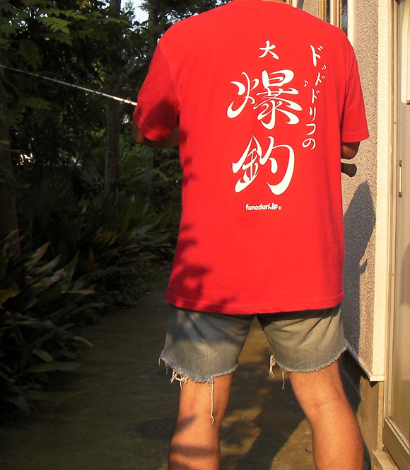 今日は新たに作った爆釣Tシャツ第2版 真っ赤バージョンを着てきました。