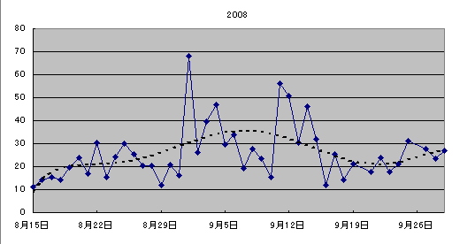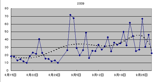 去年、一昨年とみると、9月初旬~9月後半で、いきなりドガーンってくる感じですね。