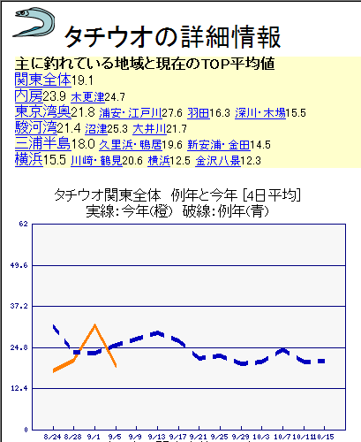 面白い事に、どの地域も同じように週末は数がでてません。こういうのを見ると、私的にはタチウオが不機嫌になる条件が明確にあるのでは?と調べたくなっちゃうんですよね~