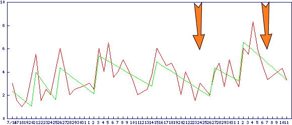 ノコギリ状のグラフは、自動判別した新群れ検知用の近似グラフです。