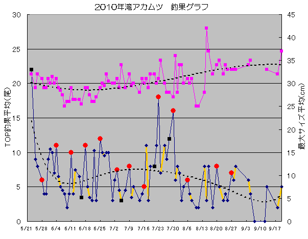 赤い丸の点が金曜日、太い線が休日、黒い四角の点がうぞっの釣行日です。