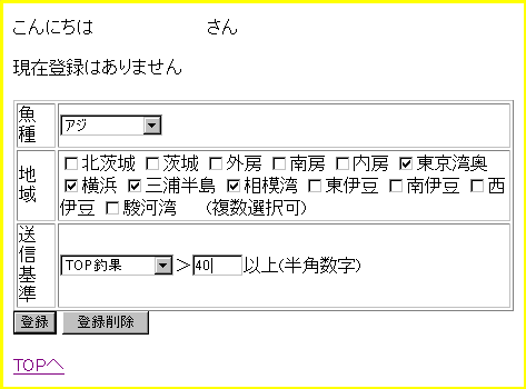 魚種、地域、送信基準を設定して、「登録」を押せば設定はOK