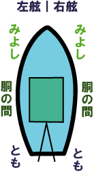 船宿に着いたら、船のどこに座るか(釣り座)を決めて受付をします。船の絵の上に番号札等がぶら下げてあって、それを取ることで釣り座を決定する事が多いです。右が船の釣り座の呼び名。先着順にクーラーを並べたり、予約時に場所を決める場合もあります。