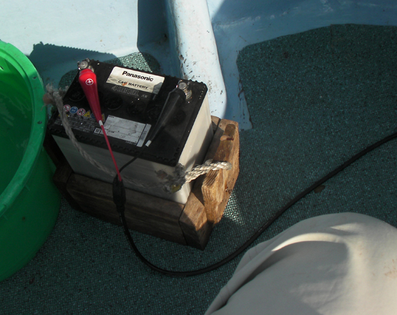 真っ暗な中、騒がしくなってお客が集まり、トモ側は、電動リールの電源口が、かなり前側にしかなかったので、延長コードない?って若女将にきくと、船長がバッテリーを用意してくれました。