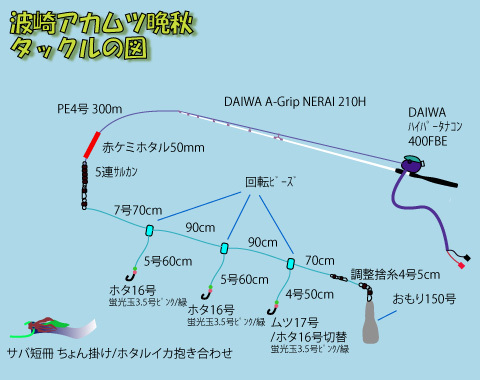 一番下の枝ハリスが短めなのは、下側にいるのは比較的小型で、小型アカムツは誘いにもよく反応するためと、外道対策として、余り底側に餌が落ちないようにするためです。