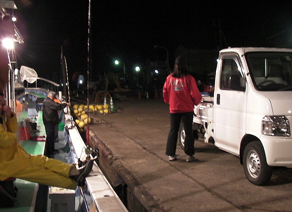 夜12時ごろ、船が停泊しているところに着くと、おおっ なんと既にお客が一名到着済み。左トモが埋まってました。