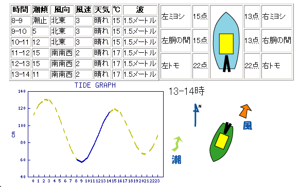 最初潮止まり直前から始まってずっと上げ潮。昼に風が回りますね。北東から南へ