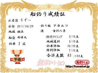 おめでとうございます。船中一尾目は白髭爺さんでした。