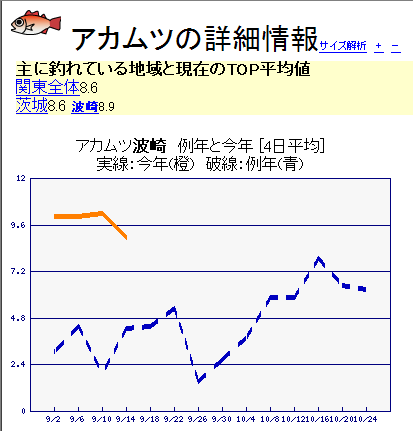 この新群れ検知用のノコギリの刃状の近似グラフで、平均4尾ぐらいを超えるのが波崎ではトップシーズンですが、例年10月ぐらいが今年は7月後半からもう越え始め、いまや近似式も10尾を超えてます。