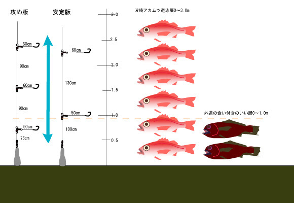 蛇足として、サバが多くて一本針にするなら、抵抗があろうとも、アカムツの遊泳層のド真ん中の、捨て糸1.5~1.6mぐらいからスタートすべきです。