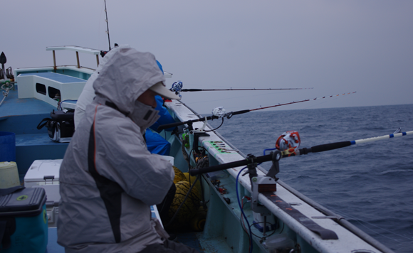 片舷6人で2本竿はちょっとひんしゅくかもしれませんね。水深深いし。