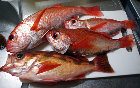 目測32、3cmの刺身サイズのアカムツと沖メバルは、内臓とエラを落として冷蔵後へ熟成直行