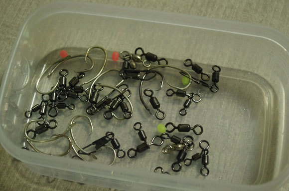 サメが多くてハリスが痛んだり、ホタ針のため外せなくて消費する仕掛けも多く、再利用するサルカンなどはこんな状態。