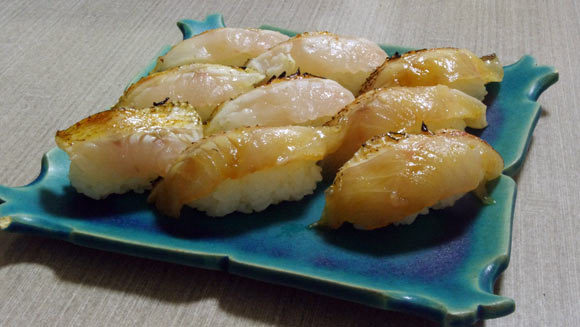 手前右側が、柚子胡椒が香るヅケ炙り握り、奥側が炙り握りです。
