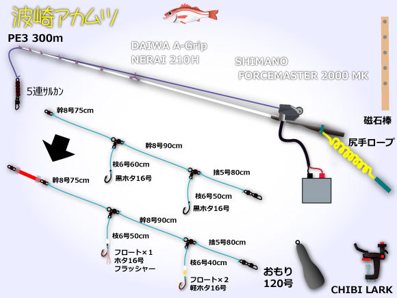 今回の仕立ては胴付き2本針厳守でPE3(~4) おもり120号指定のタックル統一。
