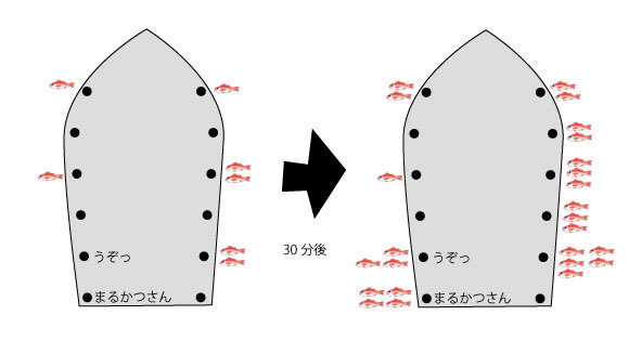 まるかつさんがアタる時は、トモから群れに突っ込んでるので、巻き上げ始めた後、俺にもすぐにアタリがあり、
