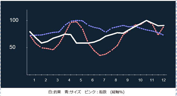 年間の釣果、サイズ、船数を、釣り物ごとにグラフ化しました。