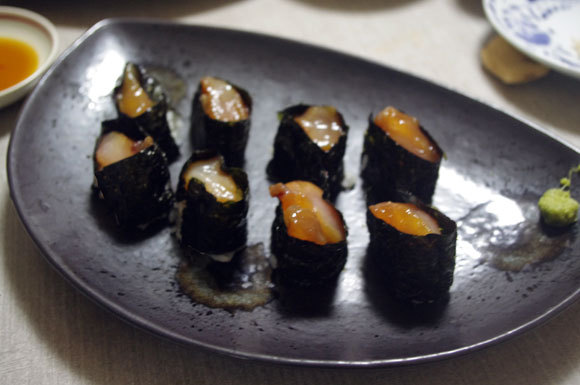 手巻き寿司で残った海苔が短くて、上手にできなかった漬け軍艦は、ピントも外したが、味だけは外さない。