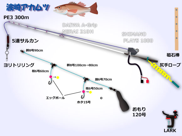 アカムツは、気難しくて目の前の餌をスルーする確率が高いので、釣り座では釣果 (ちょうか:釣れた魚の数) に影響を受けにくい魚ではあるが、すごく上手い人が潮の先に陣取ると、条件を合し込んで全部持っていってしまう時もある。