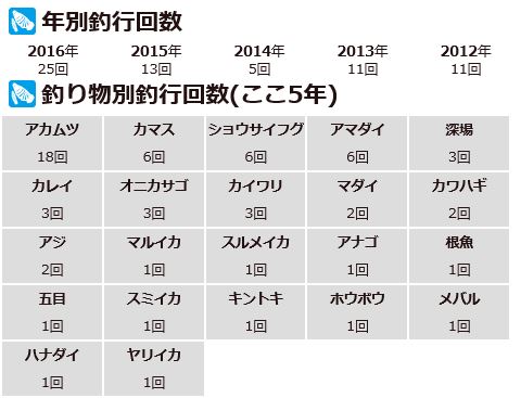 過去5年の年別釣行回数と、釣り物 (つりもの:釣り船で掲げる目標とする魚種や釣法で、もっとも本命とする魚の名前の場合が多い。例としてマダイとか根魚五目等) 別回数を追加してたんですが、