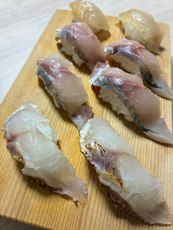 当然寿司も握ります。手前からイトヨリ、中央が金アジ、奥がアマダイの昆布締めの握りです。